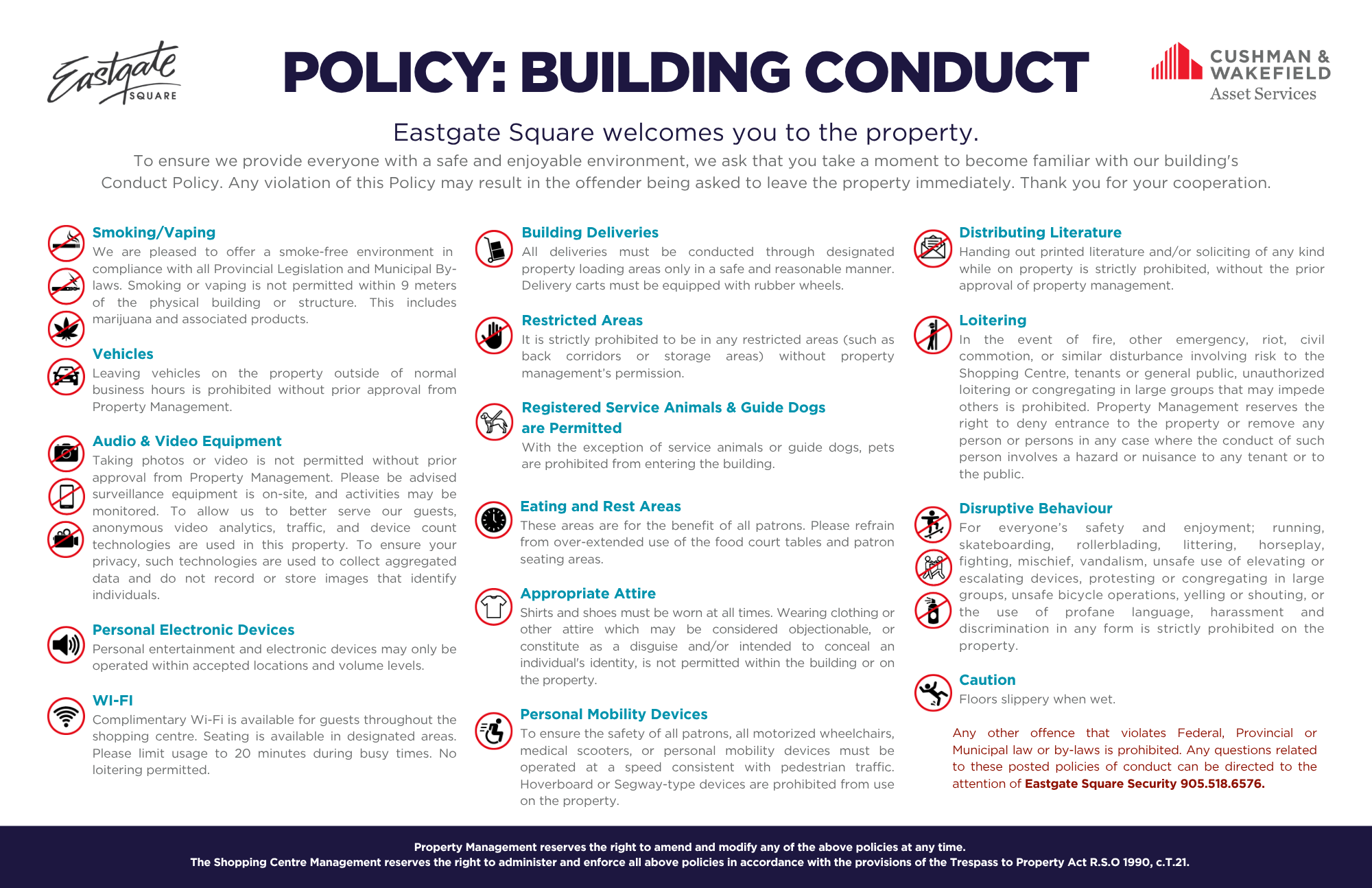 Eastgate Square offers free mall-wide WI-FI services. Simply connect your device to the 'Eastgate -Guest' public network. Please note that this is a public WI-FI network, and therefore is not as secure as a personal/home connection. Please be cautious with the information you access on public networks.